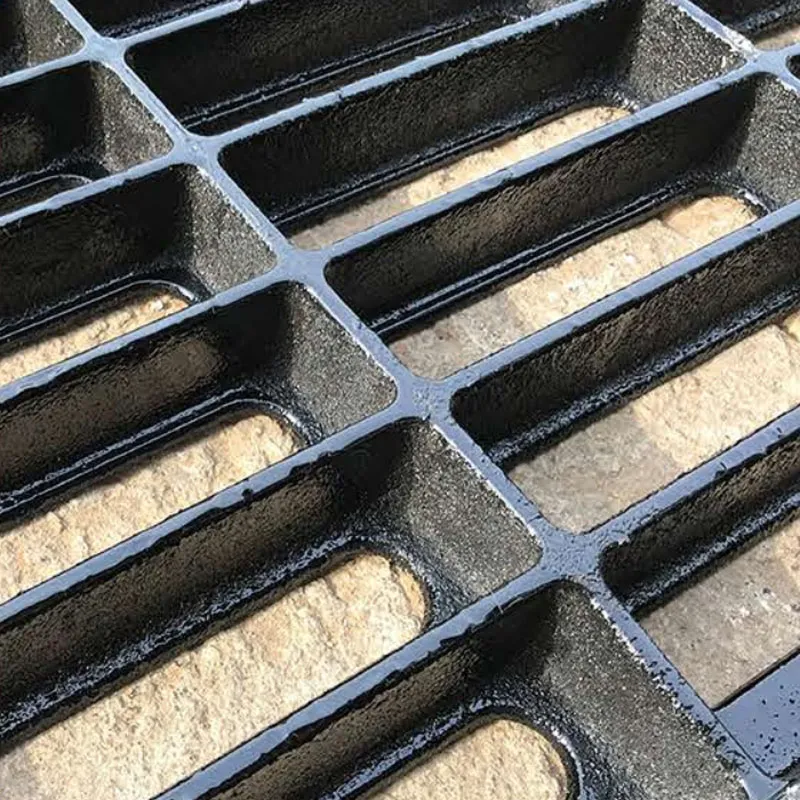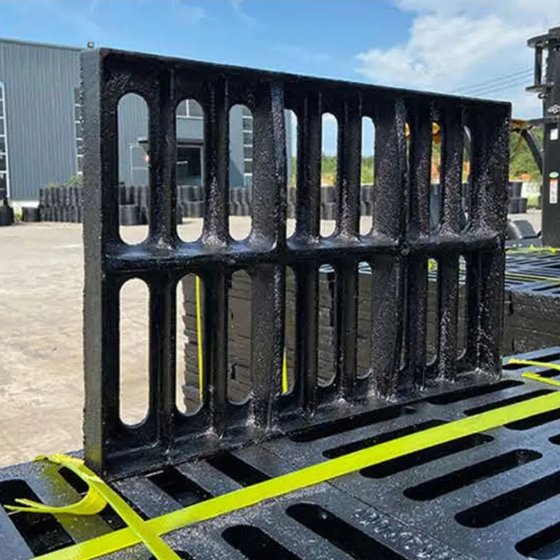 Задняя часть дренажной решетки усилена ребрами жесткости, нагрузка распределяется равномерно, использование материалов в достаточном количестве, высокая несущая способность, предел прочности при растяжении σb ≥ 420 МПа, предел текучести σs ≥ 300 МПа, одинаково с низкоуглеродистой сталью, в три раза больше, чем у материала из серого чугуна.
